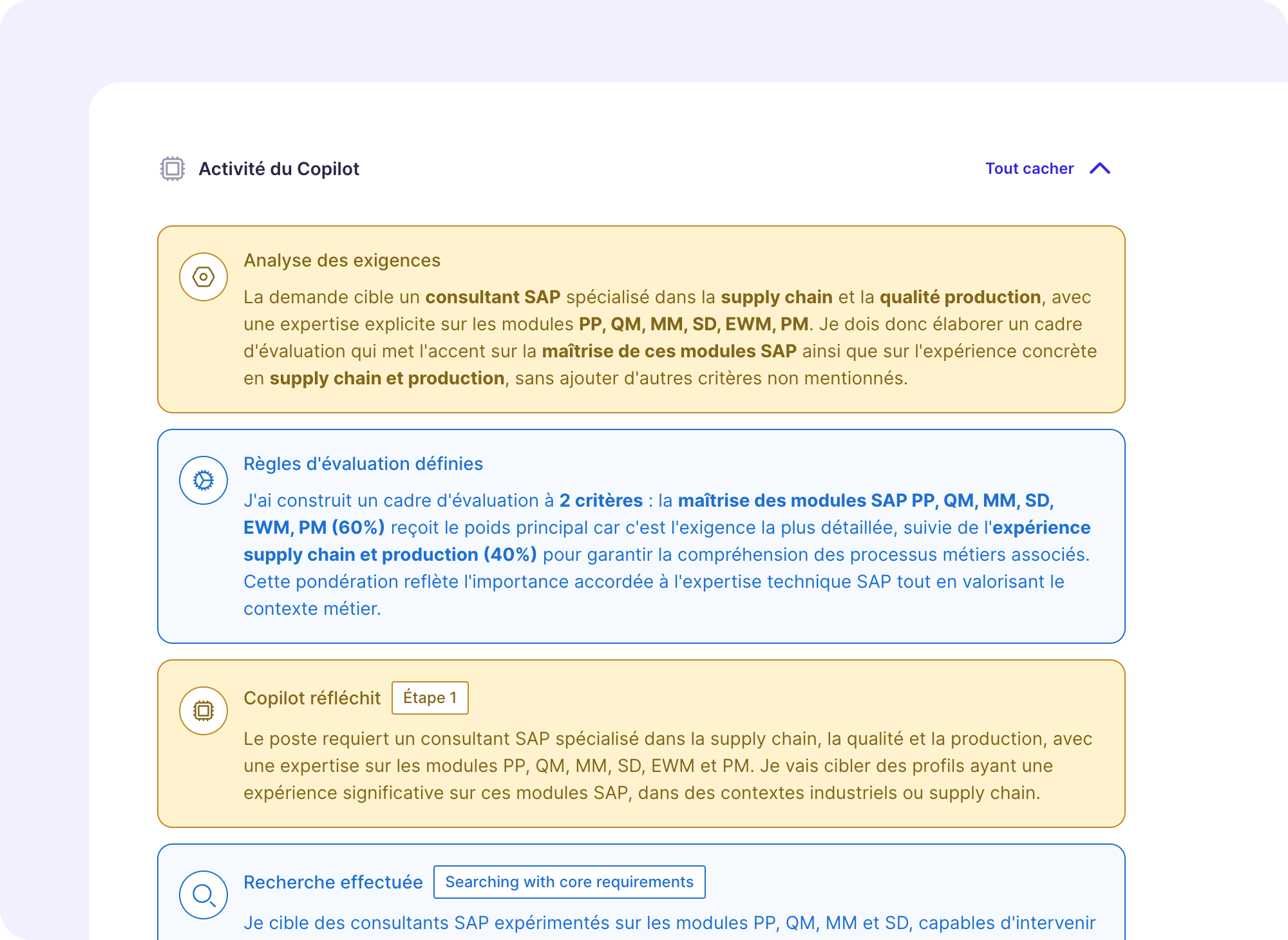 L'assistant évalue intelligemment votre demande et fonctionne par itérations pour trouver à coup sûr des profils pertinents. Mieux qu'un humain, il connaît toutes les expertises ou technologies et lance jusqu'à 30 recherches en parallèle pour dénicher les bons profils.